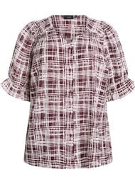 Shirt blouse met een V-hals, halve mouwen met elastiek en ruches, en verfijnde smock details bij de schouders. De blouse heeft een regular fit met een volledige knoopsluiting en is gemaakt van een lichte stof die 55% gerecycled polyester bevat.