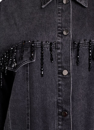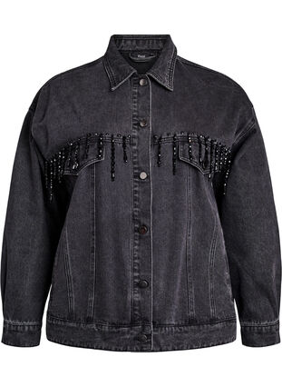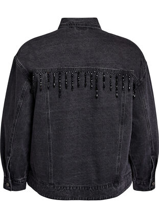 Coole denimjack met een losse en comfortabele pasvorm. De jack is versierd met parelfranjes op de borst en rug, wat een elegante touch geeft. Het heeft een klassieke kraag, knoopsluiting aan de voorkant, borstzakken en zijzakken.