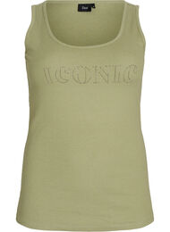 Aansluitende tanktop van een zachte en rekbare katoenen stof met een geribbelde structuur. De top heeft een ronde halslijn, brede schouderbandjes en een tekst met decoratieve strass-steentjes op de borst.