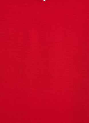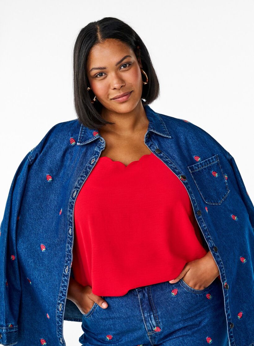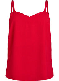 Vrouwelijke top met verstelbare schouderbandjes en een V-halslijn met een golvende rand. De top is gemaakt van een lichte kwaliteit met 51% gerecycled polyester en heeft een reguliere pasvorm.