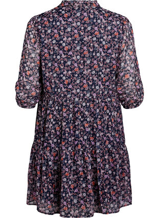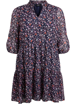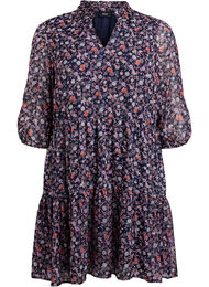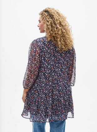 Tunic in een lichte stof met een vrouwelijk bloemenprint en subtiele glitterdraadjes. De stijl heeft een ronde halslijn met een ruchekraag en V-split, samen met een voering die voor optimaal comfort zorgt. De tunic heeft licht doorschijnende 3/4 mouwen met elastische manchetten en een A-lijn silhouet met naden die een zachte drapering en vrouwelijke look creëren.