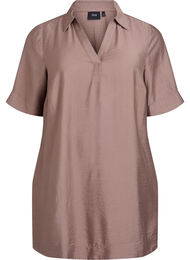 Tuniek in een zachte en lichtgewicht stof met een subtiele glans en een regular fit. De tuniek heeft korte mouwen, een klassieke kraag met V-hals en praktische zijzakken. Deze tuniek bevat 88% LENZING™ ECOVERO™ Viscosevezels, die natuurlijke zachtheid en een mooie val ondersteunen.