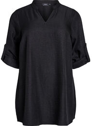 Tuniek van 100% gerecycled polyester met een normale pasvorm, ronde halslijn met een kleine V-split en een decoratief rugstuk met een gerimpeld effect. De lange mouwen kunnen worden opgerold en vastgezet met een lipje en knoopje, voor een kortere driekwartmouwlook.