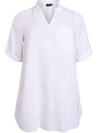 Tuniek met kraag en V-hals, borstzak, korte mouwen met omslag en zijzakken. De tuniek heeft een losse en comfortabele A-lijn pasvorm en is gemaakt van een zachte en ademende mix van linnen en viscose met een lichte textuur, waardoor deze comfortabel is en ideaal voor warme dagen.