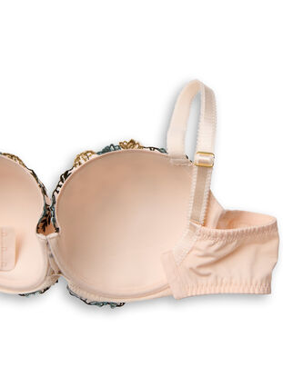 Voorgevormde bh met beugels en een vrouwelijk geborduurd bloemenontwerp op de cups. De bh heeft verstelbare bandjes en hoge zijkanten die maximale ondersteuning bieden. De voorgevormde cups zorgen voor een natuurlijke en gladde vorm van de borsten.