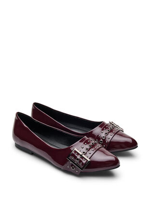 Stijlvolle ballerina met een spitse neus en een brede band met decoratieve studs. De schoen is gemaakt van imitatieleer met een glanzende lakafwerking en ontworpen voor een wide fit. De binnenzool heeft extra ondersteuning bij de boog en hiel, voor optimaal comfort de hele dag door.