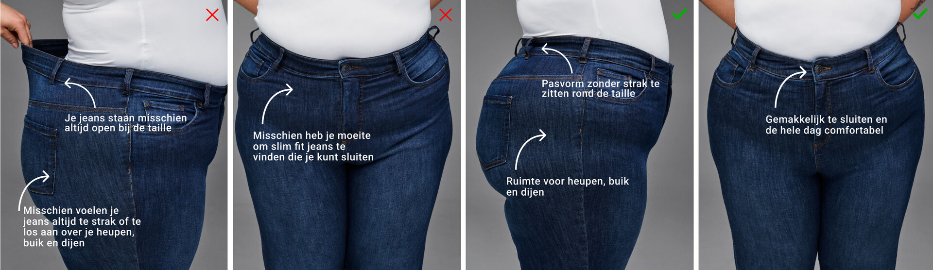 Jouw oplossing is hier – koop jeans die echt bij je passen. Deze jeans sluiten mooi aan bij de taille zonder te knellen, bieden voldoende ruimte voor je heupen, buik en dijen, en zijn makkelijk dicht te knopen terwijl ze de hele dag comfortabel blijven
