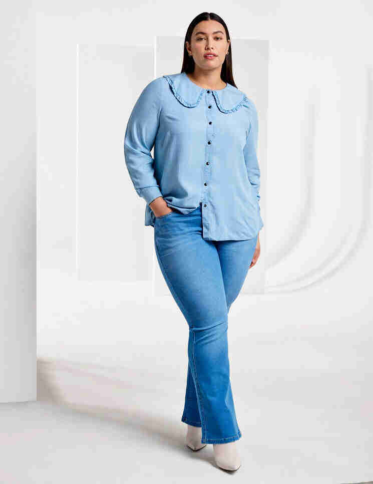 En de zachte stof wordt aangevuld met vrouwelijke details. De trend van gedetailleerde kragen en borduursels is nog lang niet voorbij. Ronde kragen en ruches krijgen een stoer randje door de denim look, en borduursels brengen nieuw leven in klassieke stijlen.